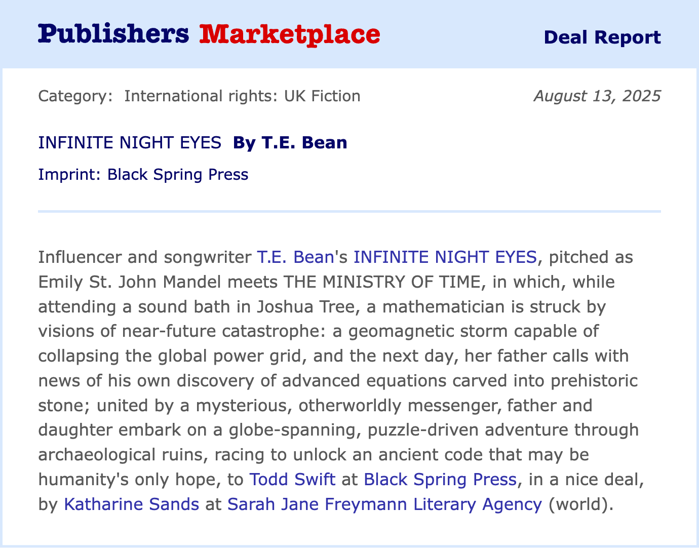 My debut novel, INFINITE NIGHT EYES, will be published by Black Spring Press (UK) and available in the USA & Canada via Simon & Schuster. Coming to a bookstore near you in autumn 2026.